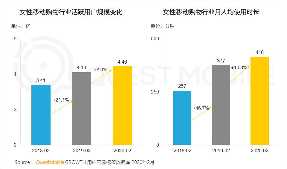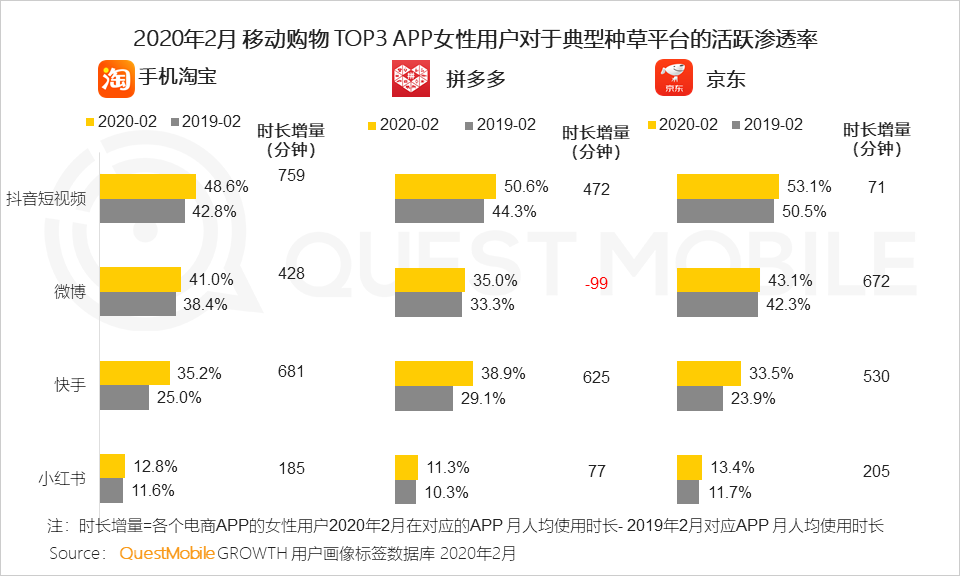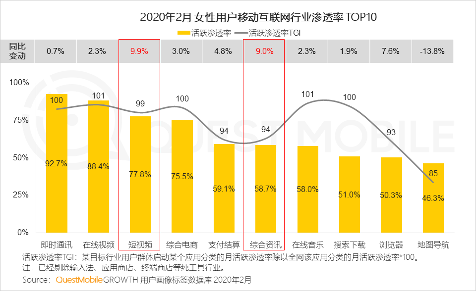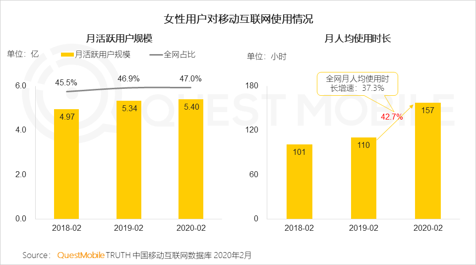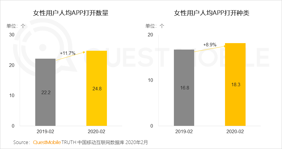 QuestMobile數(shù)據(jù)顯示,2020年2月疫情期間,女性用戶規(guī)模雖然漲幅不大(保持在5.4億左右),但是,月人均使用時長同比增長了42.7%,大大拉高了全網(wǎng)用戶時長均值,同時,女性用戶打開的APP數(shù)量也從22個增加到了近25個!從領域滲透上看,短視頻、綜合資訊用戶滲透率增加均超過9個百分點。
