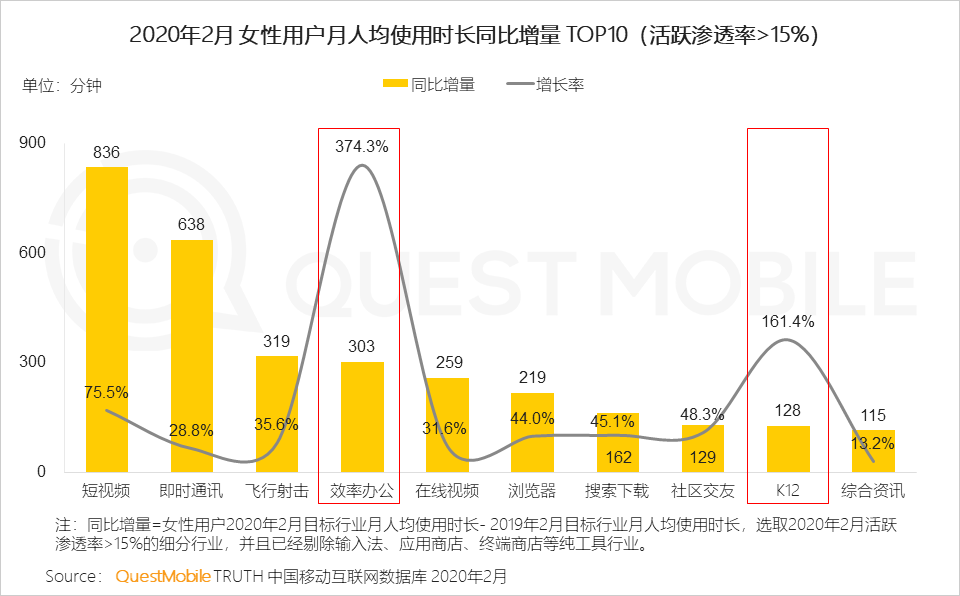 4、時長方面,女性在視頻、游戲等泛娛樂領域投入增長明顯,同時由于疫情影響,學生需要在家上課,媽媽型用戶對效率辦公、K12行業(yè)的使用時長增幅巨大。