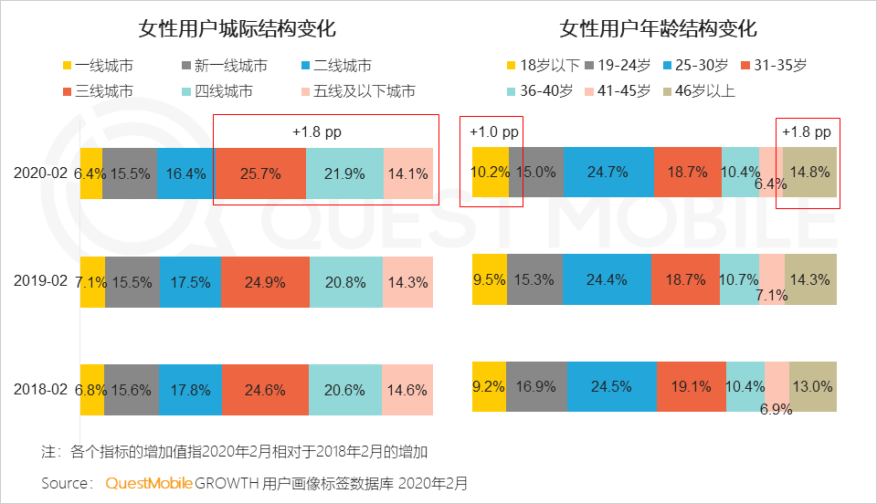 5、女性用戶結構開始向三線及以下城市傾斜;下沉市場的用戶逐漸增多。