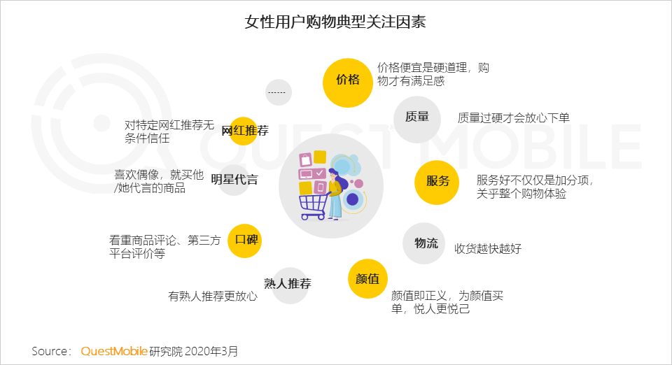 3、女性購物時,除了考慮價格、品質等傳統(tǒng)因素,社交的推薦、顏值、明星代言、網(wǎng)紅等也是吸引她們決策的理由。