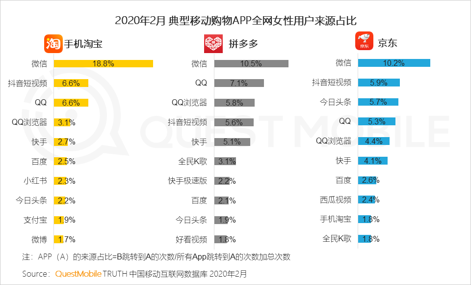 在電商領域,女性用戶規(guī)模已經(jīng)增長至4.46億,同比增長8.0%,月度人均使用時長416分鐘,同比增長10.3%。同時,女性用戶的購買路徑,也從以前的單獨刷電商APP,形成了三大典型路徑,分別是抖音、小紅書等內容平臺,微信、微博等社交平臺,以及電商直播、拼團等種草玩法,從用戶來源也能清晰看出這個路徑差異:手機淘寶來自微信、抖音的用戶分別為18.8%、6.6%,拼多多來自微信、QQ的用戶分別為10.5%、7.1%。種草玩法,與KOL關系密切。