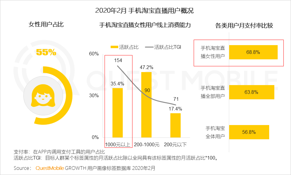 當然,直播賣貨是非常受女性同胞喜歡的模式:簡單粗暴、轉化直接高 效,支付率遠高于普通的用戶。比如,在手機淘寶,觀看直播的女性用戶支付率高達68.8%,相比之下,全體手機淘寶用戶的平均支付率為56.8%!那么,問題來了,如何抓住這些上帝呢?