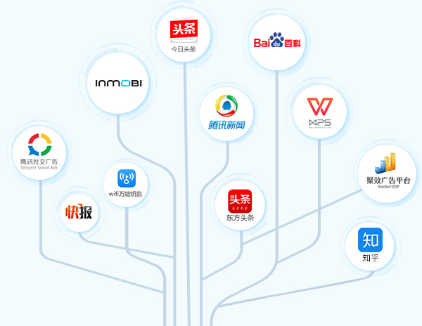 對(duì)接眾多優(yōu)質(zhì)移動(dòng)資源、移動(dòng)交易平臺(tái):百度、騰訊社交廣告、WPS、今日頭條、InMobi、360、盟聚移動(dòng)聯(lián)盟等。
